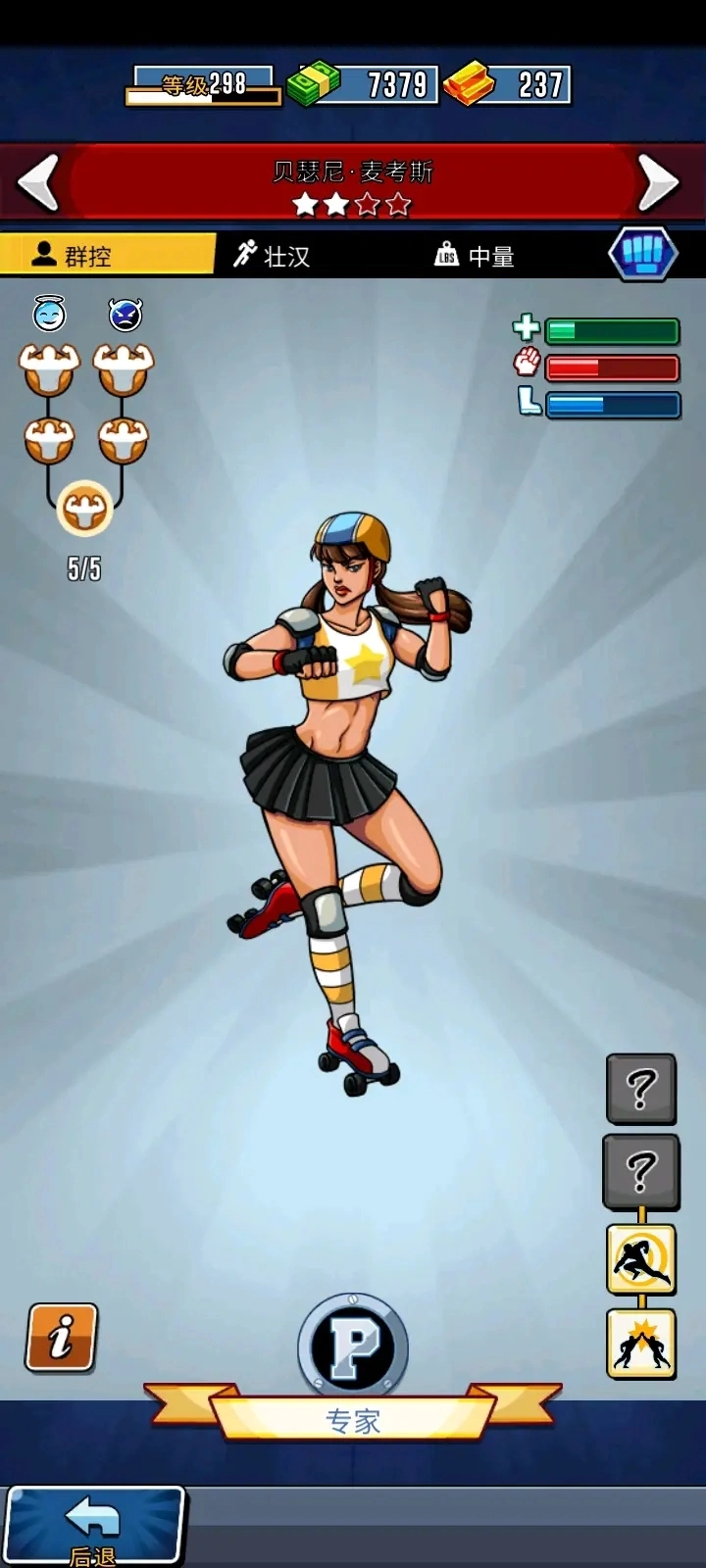 "贝瑟尼.麦考斯",在全游戏壮汉类型的角色中,有着最为突出的移动距离,恶路线的优先级比善路线略高,搭配两个辅助角色刷锦标赛6-2能在早期最为快速地获取资源,用来培养角色"LT.维贾伊.卡恩"。恶路线的“生意人”技能,再配上两个有“生意人”技能的辅助角色"布斯塔.邦普"和"水钻.里克",在每周都有的特殊事件“金钱赛”中可以获得大量游戏币。善路线由于没有“生意人”技能,所以优先级略低,不过输出性能略强于恶路线。