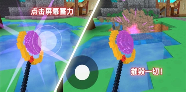 若想杀敌或大范围破坏方块,只需按住此法杖对应的屏幕区域进行蓄力,就能释放出能量波来摧毁目标。