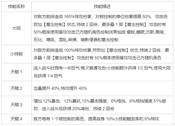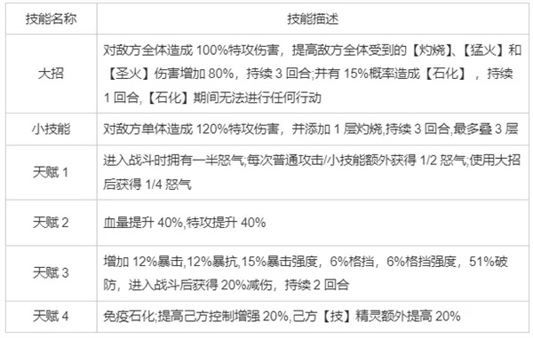 巫狐咒师是火系SSR精灵,擅长施加灼烧与石化控制。大招对敌方全体造成特攻伤害,提升目标受到的持续火系伤害,并有几率使其石化,令敌人无法行动;小技能针对单个目标造成特攻伤害,同时叠加灼烧效果。天赋方面,它初始拥有一半怒气,攻击时怒气累积速度快,还能显著提升自身血量与特攻;其他天赋则强化了生存能力与输出能力,包括增加减伤效果和破防能力。最后一个天赋特性为免疫石化,且能提升队伍控制效果,尤其增强己方技能型精灵的控制强度,为全队战术执行提供有力支持。