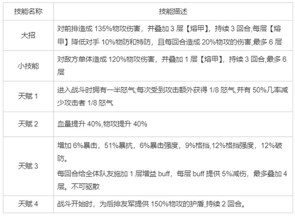火炎朱雀是火系SSR精灵,在战场上承担群伤减甲的角色。它的大招既能对前排敌人造成物理伤害,又可施加【熔甲】效果,该效果会降低敌人的物理防御与特殊防御,还能带来持续伤害。小技能也能对单个目标叠加【熔甲】,进一步增强减甲效果。其天赋让它以半怒气状态开局,同时提升自身怒气获取速度,并能干扰敌人的怒气积累。此外,它的血量和物理攻击属性有明显加成,这使得它的生存能力和攻击能力都得到了提高。其他天赋则强化了全队的减伤能力,会给全体队友施加不可驱散的增益buff,而且在战斗初期能为后排友军提供显著的护盾,这些都提升了队伍的整体防御水平。