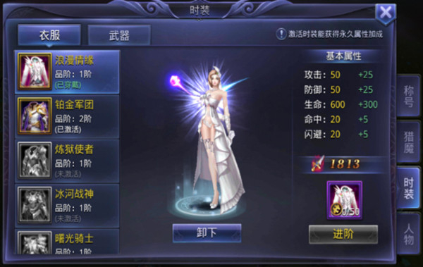 时装的激活与进阶需要消耗时装碎片,这些碎片可通过结婚、连续登录、七日活动、累充活动等途径获取。角色穿戴时装后,外观效果十分酷炫。