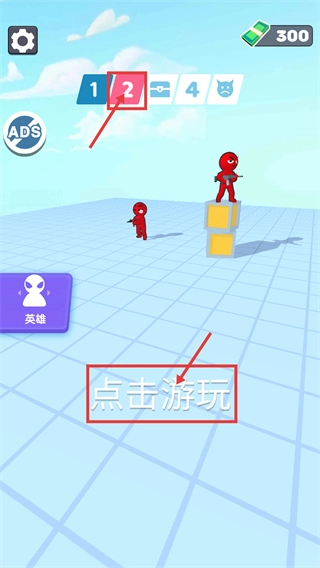 点击【点击游玩】按钮即可进入关卡,界面顶部的【2】标识代表当前所处关卡,此外还能看到【ADS】标识以及英雄按钮。