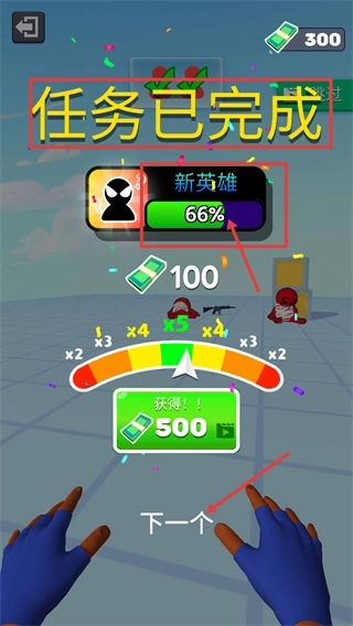 任务结束后点击【获得!!】按钮,即可领取【100】与【500】货币,与此同时新英雄的解锁进度将更新至【66%】,之后可点击【下一个】按钮进入后续关卡。