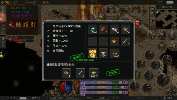 每天登录都能领取丰厚礼包,里面包含宝石、元宝以及各类装备道具。