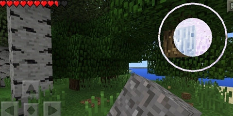 第二天清晨,是时候离开临时的栖身之地去收集资源了。在Minecraft这款游戏里,获取同一种物品的途径有很多,但在游戏刚开始的阶段,你只能依靠双手去获取所需的材料。就拿木头来说,你得先走到树的旁边,用手指长按树干的中间部分,一直等到白色的进度条填满手指对应的圆圈、树干的一段碎裂并掉落在地上,而且你把它捡起来之后,才算真正获得了一块木头。这种方法同样适用于采集沙子、泥土和黏土之类的资源。