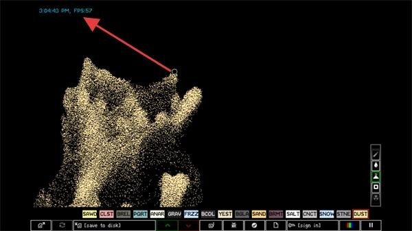 玩家当前的使用时间和游戏帧数会显示在界面左上角,目前采用金色粒子造型呈现,需确认该造型的绘制效果。
