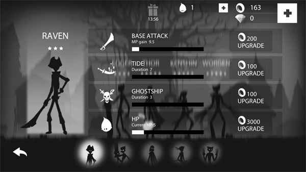 进入游戏后会出现五位不同的火柴人,除了第一位初始火柴人之外,剩下的需要用金币和钻石来解锁。