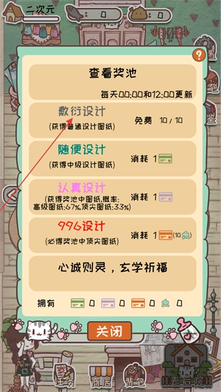 进入设计界面后,会弹出查看奖池的窗口,此时选择“敷衍设计”选项,就能免费获取普通设计图纸,该选项的可用次数每天都会更新。