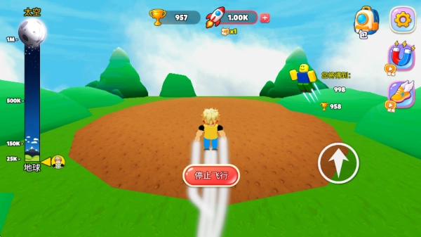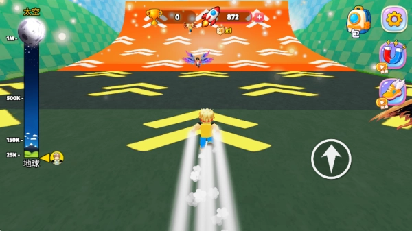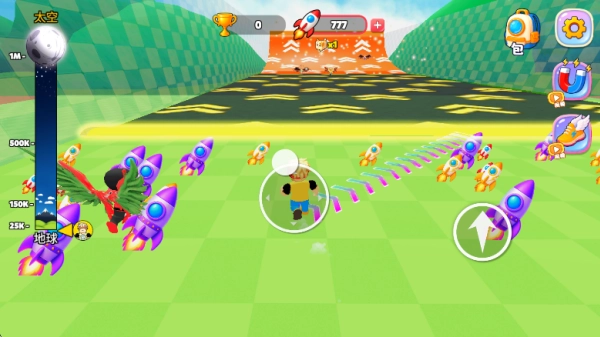 你需要操控主角在场景中移动,收集分布在各处的火箭。这些火箭是推进功能的能量来源,收集到的火箭数量会直接决定冲刺时的速度快慢。