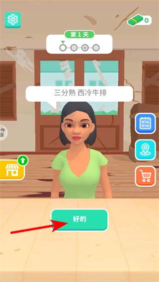 在顾客点单的界面上,找到那个被红色箭头所指的“好的”按钮并点击它,以此来确认接收这份三分熟西冷牛排的订单。