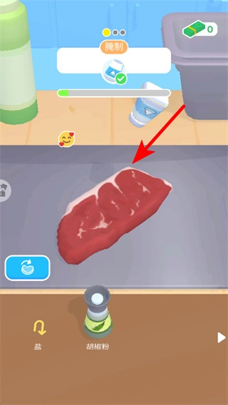 把盐罐拖到红色箭头所指的牛排那里,给牛排撒上盐,这样就完成了第一步的调味步骤。