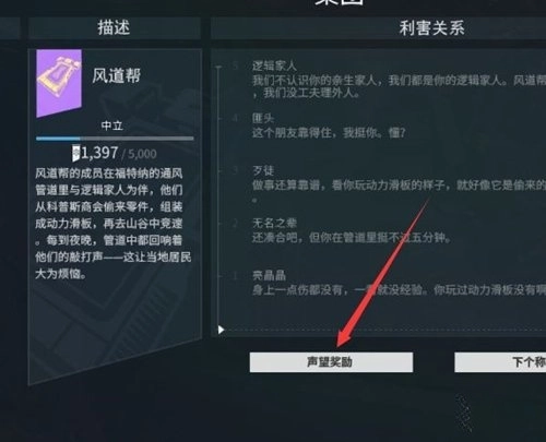 驾驶滑板时尝试触碰到那些小星星,就能获取风道帮的声望;若想使用这些声望,则需要点击“声望奖励”按钮。