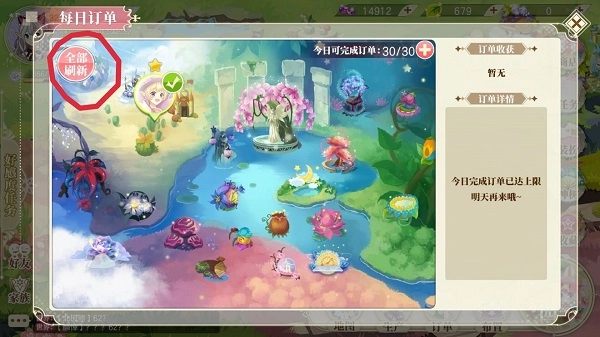 瞧!直接点击这个“全部刷新”按钮就行啦,每天有两次免费刷新订单的机会,剩下的刷新机会得用神叶来换哦。(别心疼神叶,后面还会送很多哒~)