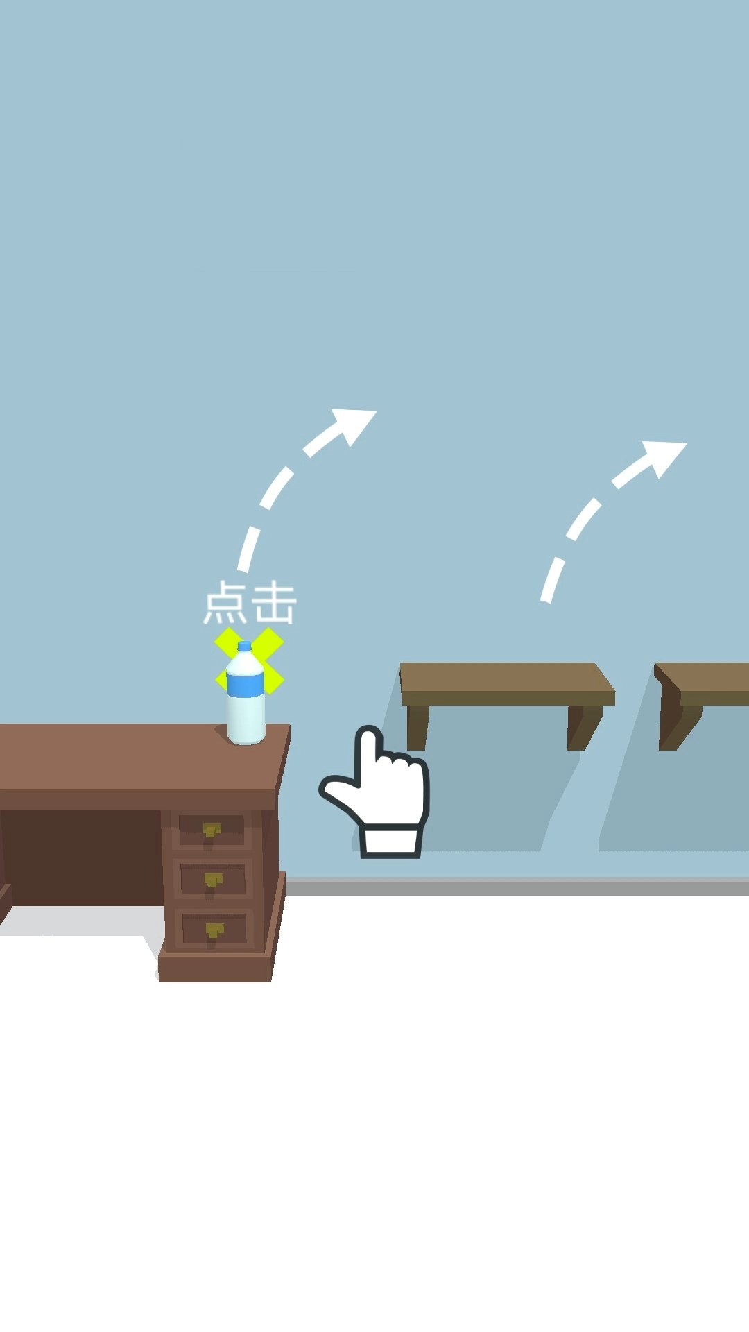 在瓶子下落的过程里,要抓住合适的时机点击屏幕,让它在碰到能站立的物体时马上起跳,从而完成连贯的连续跳跃动作。