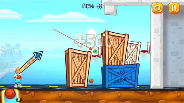 在关卡里跟着箭头指示调整投篮的角度,对准木箱旁边的篮筐所在位置,做好投掷篮球的准备,以此推动当前关卡的进度。