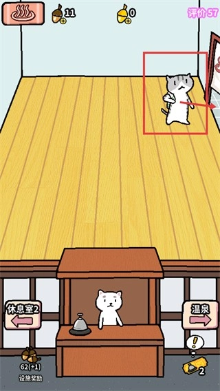 在前台场景里,点击处于框选状态的动物顾客,引导它前往温泉区域,目前橡果数量是11,评价分数为57。