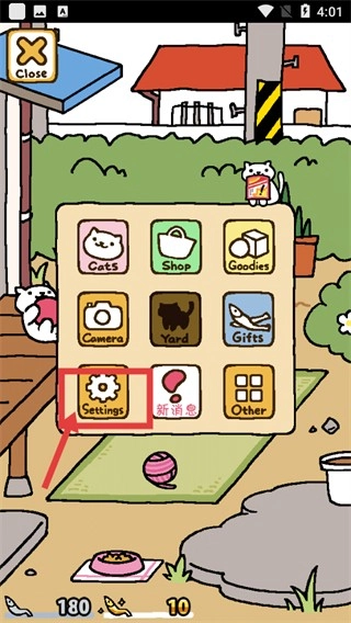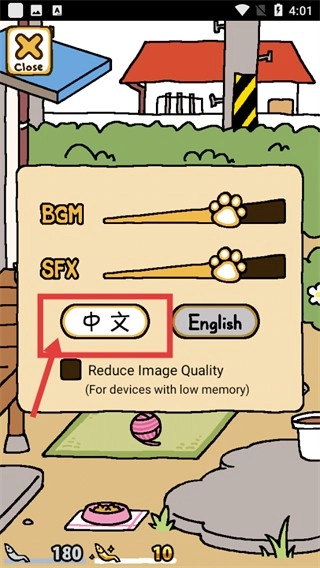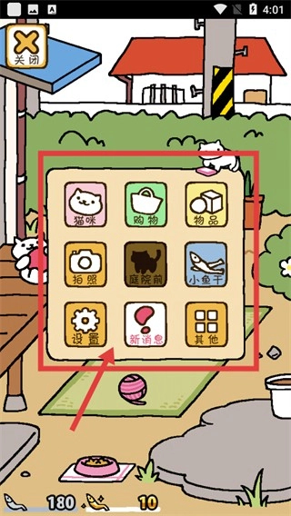 语言切换完成后,功能界面的标识会变成中文显示(像猫咪、商店这类),操作起来会更方便,这样就能接着推进庭院的互动流程了。