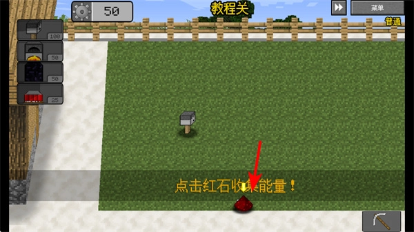 在战场上点击红石就能收集能量,这些能量是部署和升级器械的关键资源,持续收集可以快速增加防御装置的数量,增强对僵尸的火力压制效果。