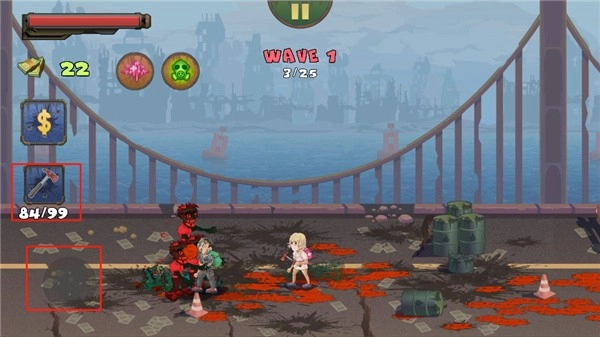 你可以用左侧的虚拟摇杆来操控角色移动,角色会自动对进入攻击范围的僵尸发起攻击。你的任务是在僵尸的重重包围下存活,只要消灭掉所有敌人就能顺利通关,还能获取金币用来提升角色等级。