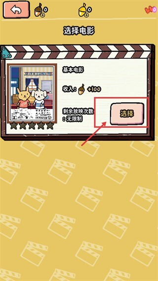 在影片选择界面,点击被框选的【选择】按钮,即可确定播放【基础影片】,这部影片能够带来【+100】的收益。