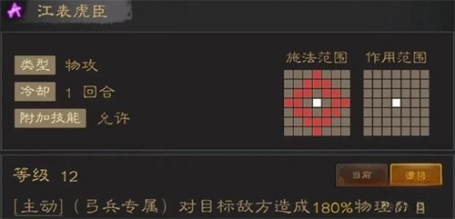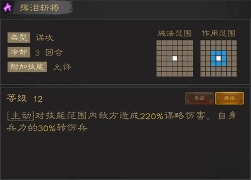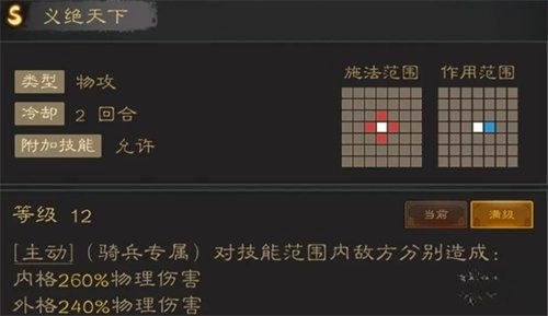 高倍率两格范围的范围伤害技能,单论倍率的话,在前期可获取的技能中绝对能排进第一梯队,适配所有近战骑兵将领,尤其适合主打秒杀流的玩法。