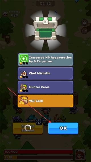 击败BOSS后打开宝箱,能获取增益效果与金币奖励,点击OK按钮就能领取奖励并继续游戏。