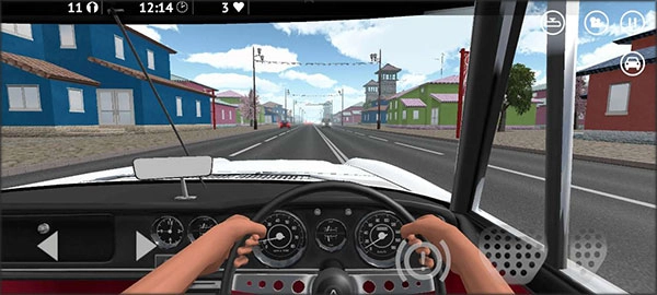 左上角第一个显示的是行驶距离,中间是时间计时,接着是生命值。一旦车辆发生碰撞,就会损失一格生命值。右上方的图标信息按顺序为后视角、相机(用于视角切换)、暂停和菜单按钮,还有车辆内部的灯光、喇叭以及转向灯。