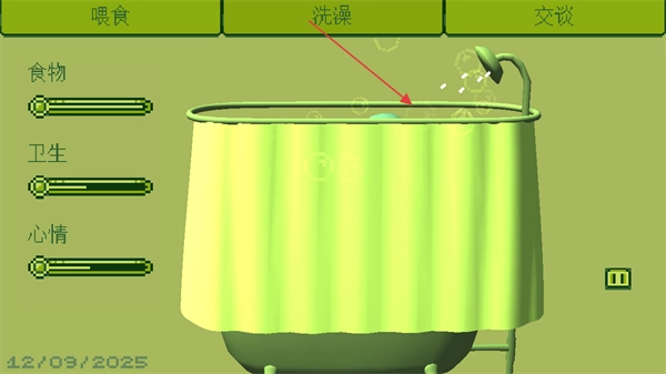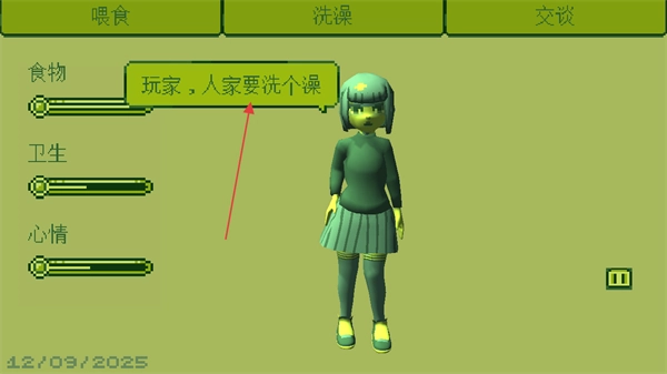当女孩提出想要洗澡时,系统会切换至洗澡界面,同时触发洗澡相关的动画效果,并使卫生进度条得到提升。