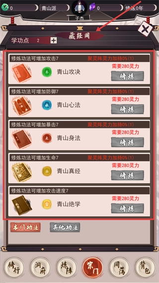 在藏经阁里,建议优先挑选能提升攻击属性的《青山攻决》进行修炼,以此增强自身的战斗能力,为接下来挑战后续章节做好准备。