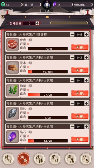 在洞府内合理调配道仆,安排至【食库】与【原木】的生产项目中,通过升级对应建筑来提高资源产量,以此确保修仙所需资源的稳定供应。