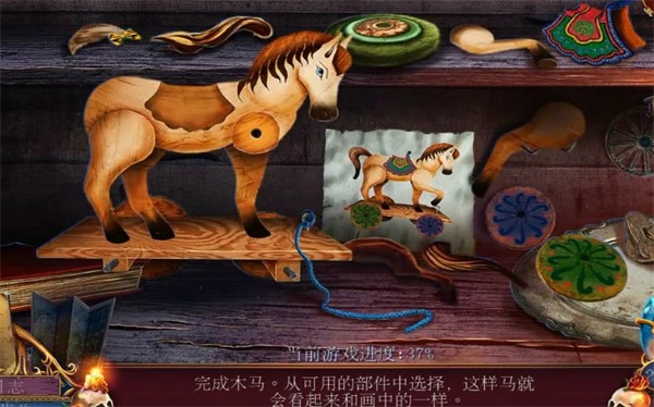 最后一个谜题是拼装木马,玩家需要按照图示来组装。具体步骤是:把四个轮子安装在木板的四周,将坐垫放置在马背上,再把蓝色绳子系在马的脖子上,这样就完成拼装了。