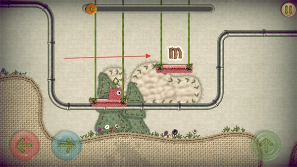 操控红色小怪物朝右移动,靠近秋千所在区域,为借助秋千移动做好准备。