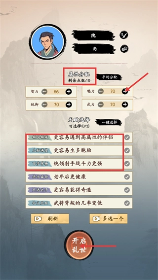 在属性分配页面,利用【剩余点数:10】来调整各项属性,勾选【倾国倾城】-【儿孙满堂】这类天赋后,点击【开启乱世】按钮即可进入游戏。