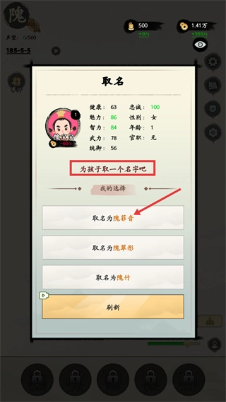 在命名界面,为孩子挑选【取名为隗菲音】这类名称选项,完成孩子的命名步骤,推动游戏进程。