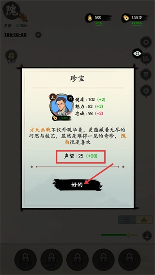 收下【方天画戟】后,获得【声望:25(+20)】等增益效果,点击【好的】关闭提示框,即可继续游戏进程。