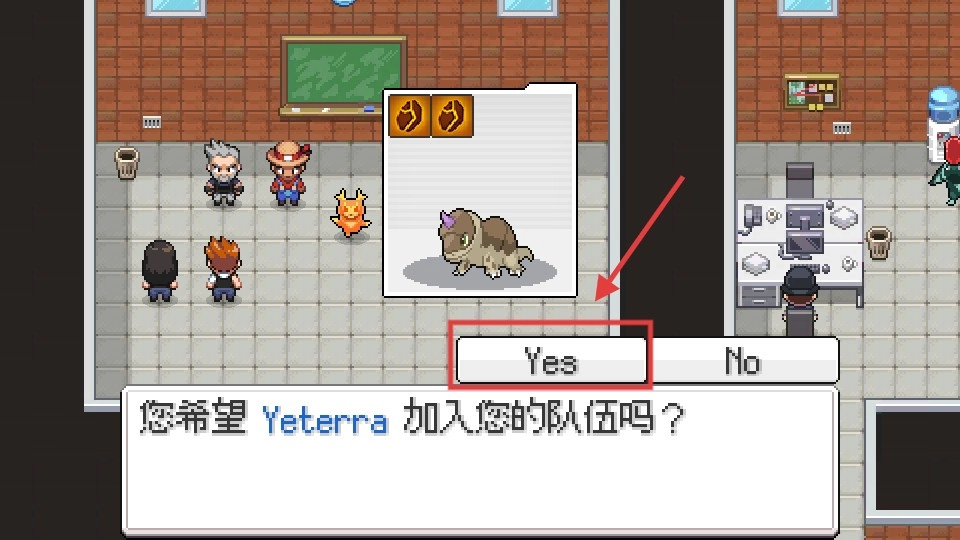 招募精灵时,若想让【Yeterra】加入队伍,点击【Yes】按钮就能成功招募。