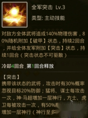 一技能全军突击:对敌方全体武将造成140%物理伤害,80%概率随机为目标附加[破甲]状态(持续2回合),同时给全体友军附加不可驱散的[突击]状态(持续1回合);技能冷却4回合,第1回合即可释放。