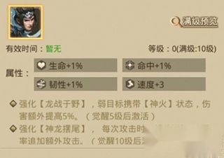 神赵云在游戏中觉醒后,一技能会得到强化——释放一技能“龙战于野”时,若敌方处于神火状态,将额外提升5%的伤害;同时,三技能“神龙摆尾”也会被强化,使用该技能时触发额外追击的几率会增加5%。
