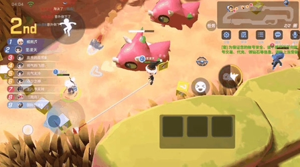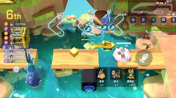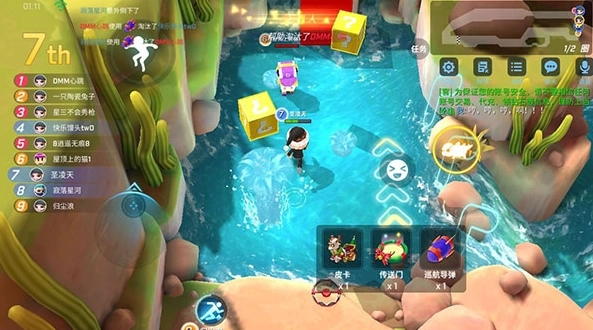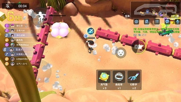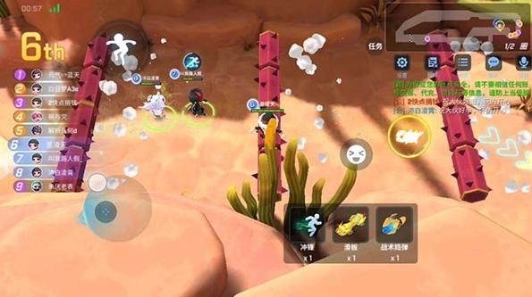 这个区域分为两部分,里面的障碍都是摇摆类型的(在《逃跑吧少年》里被称作“咸鱼大摆锤”)。要是在较低的水面上使用跳高类道具,很容易被这些摆锤攻击到。其实从桥上走是个不错的选择,走水面也挺好的。第一部分摆锤之间有空隙,借助捣弹和皮卡的高速度可以直接冲过去,不过得小心别被摆锤打到。用跳高道具或者滑板也能跳过摆锤,不用担心,那些绳子是没有伤害的。第二部分用载具通过比较看运气,建议走水路。从水路走的话,可以用飞爪抓住对岸的石头来快速移动,也可以用震荡波进行向前位移。