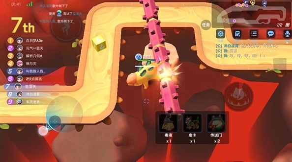 这是个挺看运气的路段,搞不好刚攒满皮卡捣弹的冲锋能量想反超第一,恐龙就突然冒出来怼脸,说直白点简直让人血压飙升。优先选传送门和护盾,跳高、阻挡箱、滑板这些道具也能用来跳过恐龙躲伤害。要是想搭配皮卡、捣弹这类载具,和气垫组合起来效果很不错。要是到了最后一圈,可以故意卡在第二留个巡航导弹,这样反超起来就轻松多了。