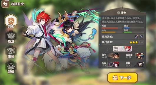战士:作为斗士型职业,拥有强劲的攻击力与破坏力。借助大型近战武器及技能,能将自身火力大幅提升。后续可转职为督军或狂战士,最终进阶为龙战士或狂神。