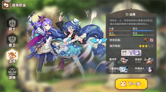 法师:精通水、火、风、地四系元素魔法的职业。凭借超凡的精神力施展魔法以辅助同伴。后续可转职为魔法师或吉他手,最终进阶为元素祭祀或吟游诗人。