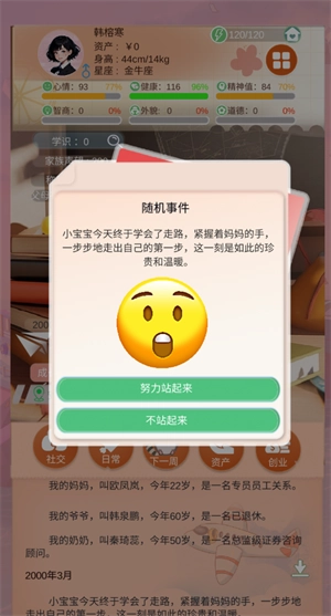 游戏进行时会随机出现一些突发事件,你得做出抉择,而你所做的每一个选择,都将改变你后续的人生轨迹。