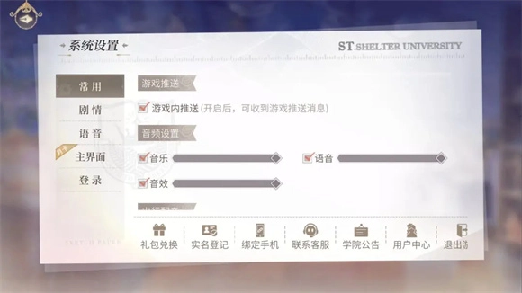 左上角第一个图标是设置按钮,在设置界面中,你可以进行退出账号、绑定手机号等操作;礼包码兑换功能则位于常用设置板块,这里还能调整音量大小,以及选择出行配音的语言类型,比如普通话或日语等。