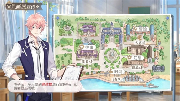 画展在综合楼举办,有4个可选地点。通常陈子涵推荐的红色字地点是最优选择,但偶尔也会反常地推荐次优地点。等级越高,等级加成越高,画展结束时获得的金币也就越多。需要留意的是,这里存在一个隐藏成就,达成条件是连续3次选择不符合主题的卡参与画展。