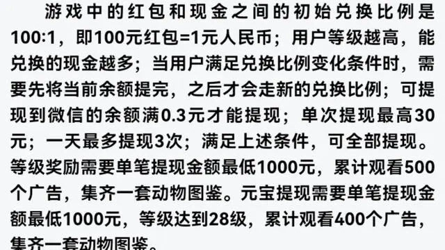 ⑧等级奖励的获取条件为:单笔提现金额不低于1000元,累计观看广告数量达到500个,且成功集齐一套动物图鉴。