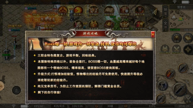 2、本服务器里,除了特殊四格装备外,其他所有装备都需要通过战斗获取,BOSS会掉落所有物品,角色血量越高,掉落概率就越好。每张地图都设有一个领地BOSS,其掉落概率非常高,建议大家留意BOSS查询面板。