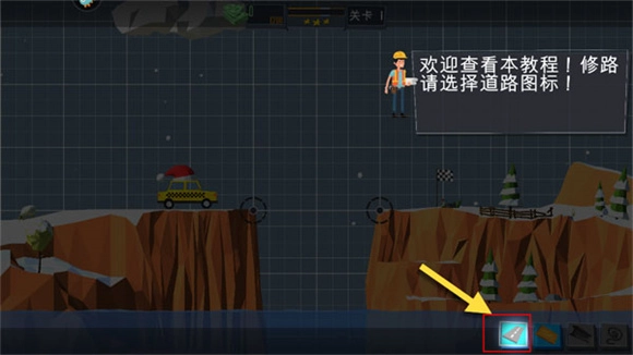 打开游戏后会出现一个开启按钮,点击该按钮即可进入搭桥铺路的游戏关卡界面。此时会有新手教程引导,在修路环节请选择道路图标进行操作。