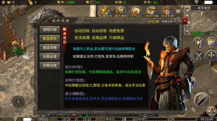 温馨提示:所有职业均可自由转换,前期推荐选择法师,因其打怪效率高、发育速度快,建议后期再考虑转职。