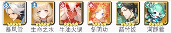 1、入门阵容:暴风雪、生命之水、牛油火锅、冬阴功、箭竹饭、河豚君